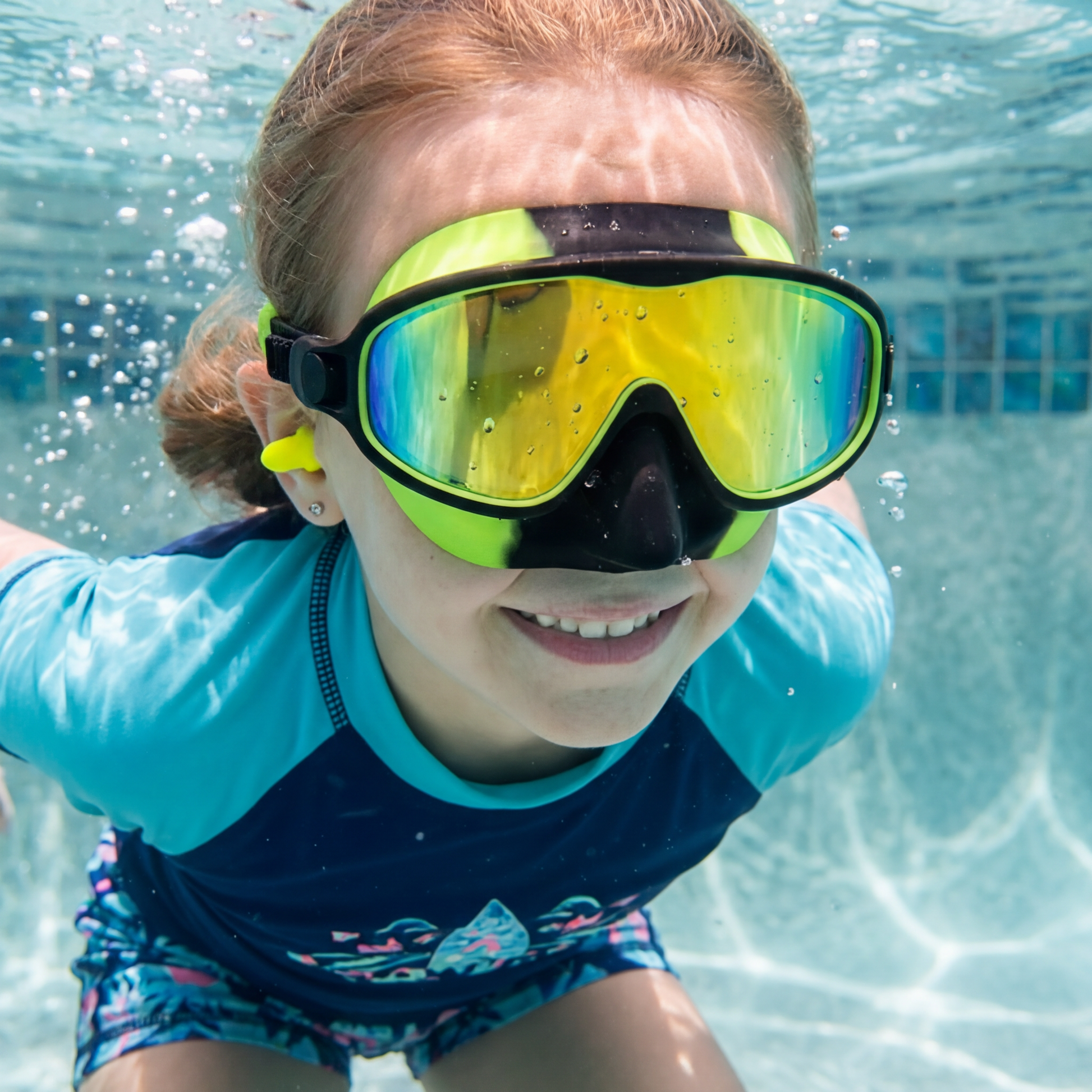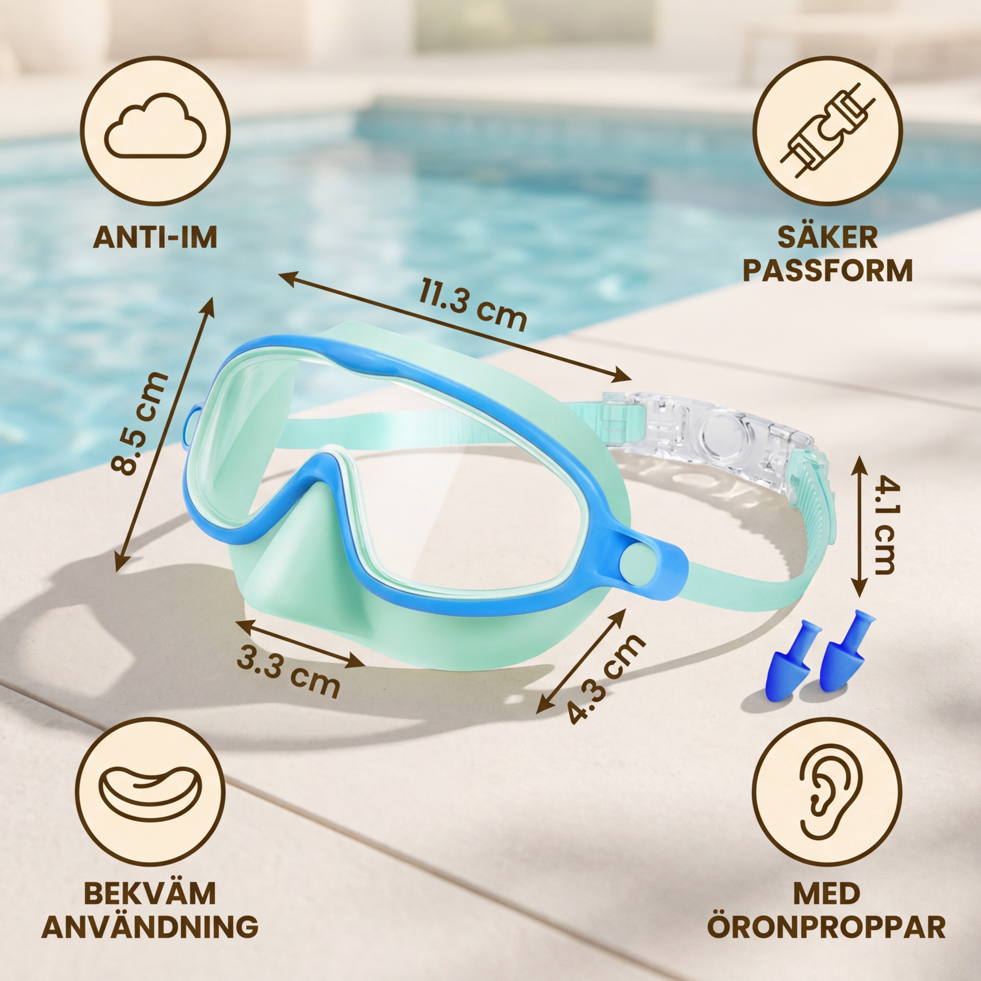 • Egenskaper: Simglasögon med justerbart band, bred tätning runt ögonen, anti-im funktion och medföljande öronproppar.