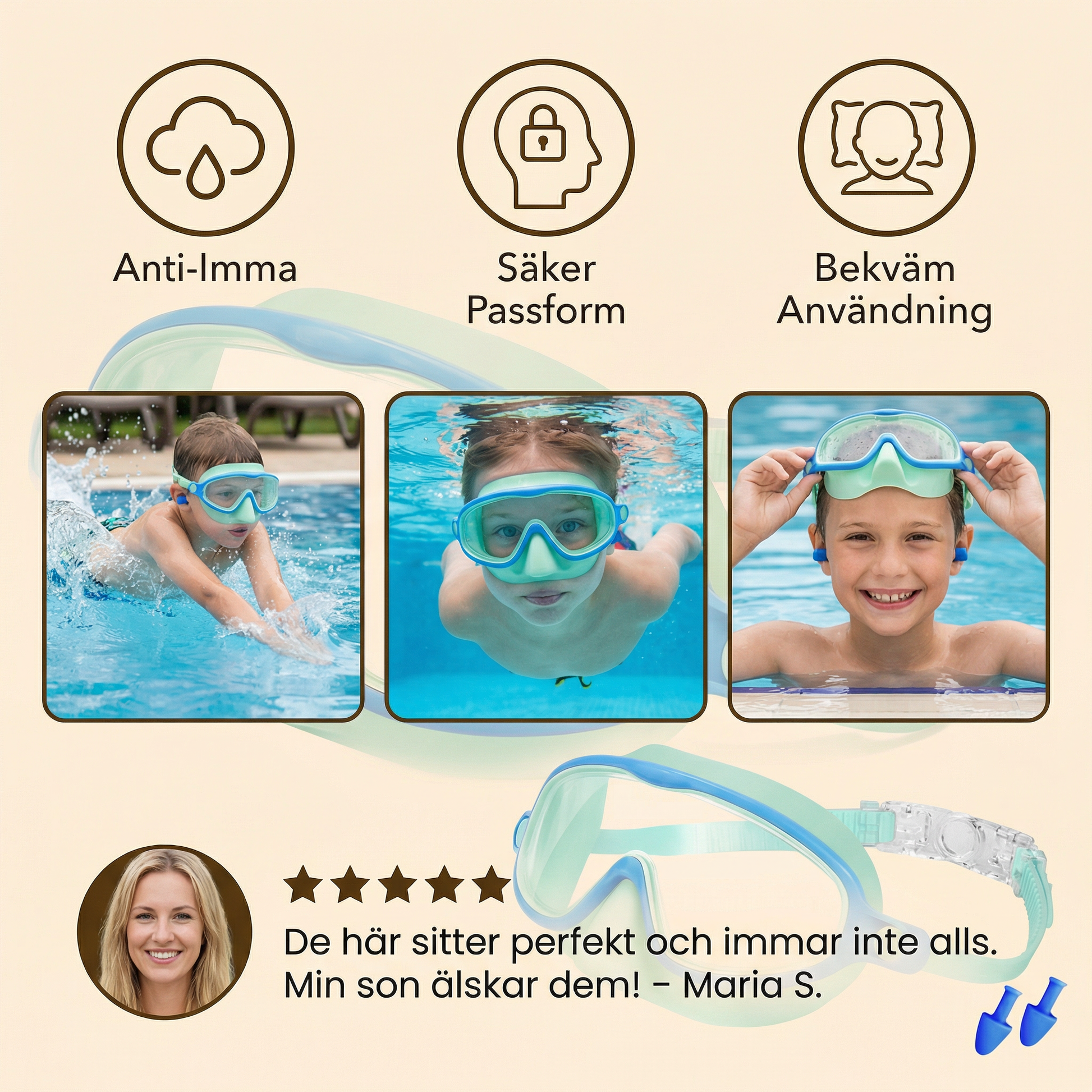 "Simglasögonen sitter perfekt på mitt barns ansikte och läcker inte ens under längre simpass. Anti-fog-funktionen fungerar verkligen bra och gör att barnet kan se klart hela tiden i vattnet."